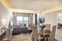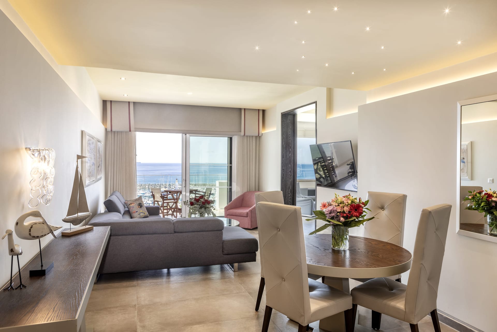 Completely renovated in 2017 with no expenses spared, these modern and spacious suites (only two available) provide every modern comfort and luxury. A king size bed (180cmx200cm) looks over the side glorious views of the hotel which incorporates the mountainous backdrop against Limassol's beautiful bay. A luxurious free standing signature bathtub is incorporated into the room along with a large rain shower cubicle, separated wc, two washbasins and contemporary lighting features. The lounge has its own WC and a second TV which can be viewed from either the dining area or the comfortable designer sofa, while overlooking the blue azure of the Mediterranean.